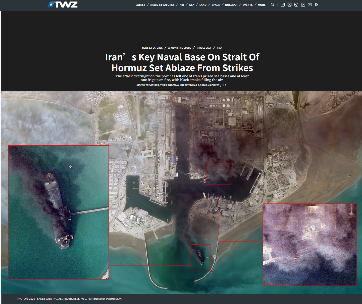 当下美媒《战区》注意到,Bandar Abbas卫星拍摄的卫星图显示,伊朗海军总部阿巴斯港遭遇了严重破坏,阿巴斯港遍布浓烟。伊朗海军吨位最大舰艇,满载排水量高达12万吨的马卡兰号前进基地舰,也被命中,并燃起了滚滚黑烟。似乎还有多艘护卫舰受损,但具体情况无从得知。
